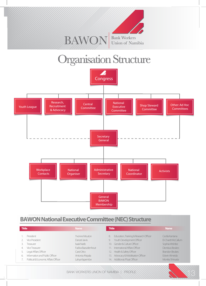 The National Executive Committee also appoints the key Union staff –the Secretary General. The Secretary General in-turn–will appoints from within its own ranks those employees who will serve with the Secretary General to run the operation. Following is the BAWON structure: